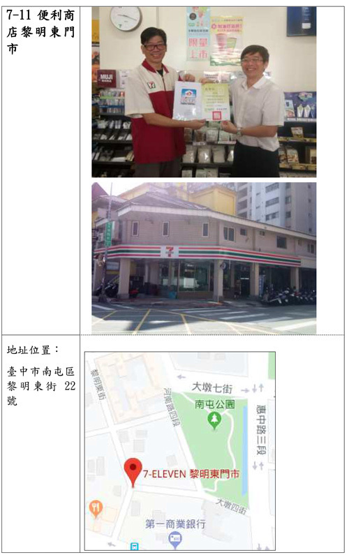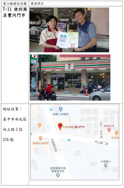 | 1 | 7-ELEVEN便利商店 豐河門市 臺中市南屯區向上路二段376號 |