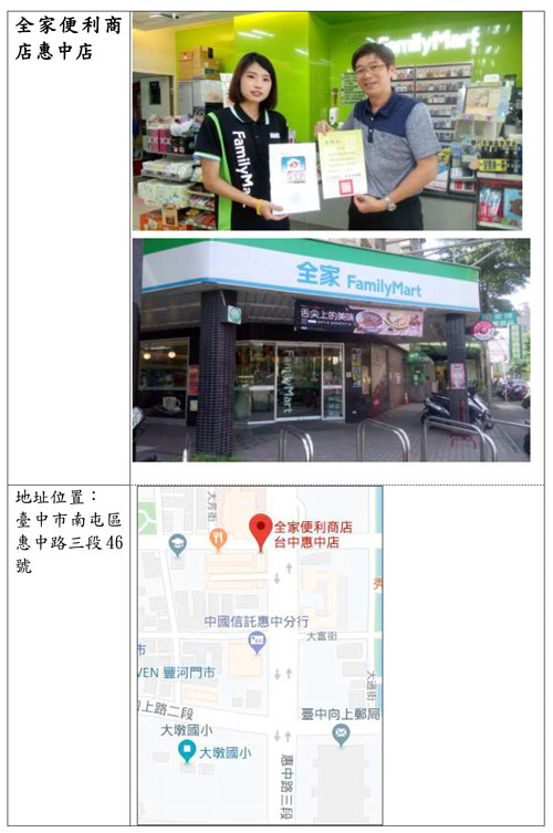 | 3 | 全家便利商店 惠中店 臺中市南屯區惠中路三段46號 |